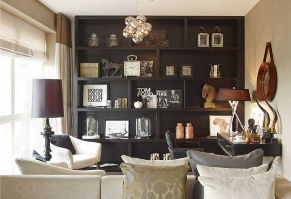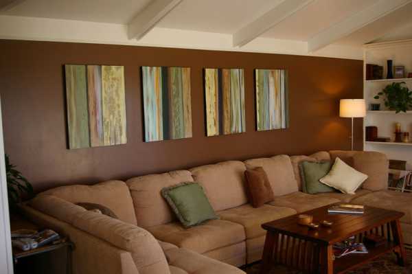 Интересный вариант будет иметь гостиная, стены в которой декорированы шоколадными оттенками, потолок покрашен белой краской, оконные проемы оформлены текстилем из натурального льна, а для напольного покрытия выбрана натуральная древесина (паркет).