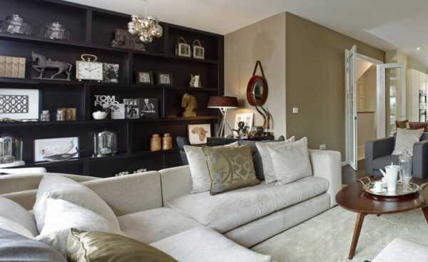 Темно-коричневый или черный пол придает гостиной воздушность, визуально приподнимает полоток в помещении.
