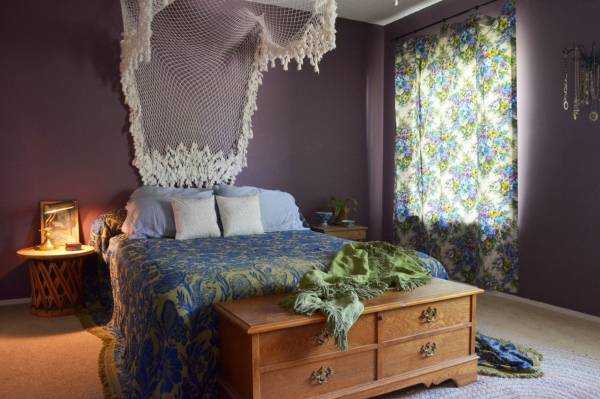 При необходимости интерьер в стиле бохо можно создать в отдельной комнате, произвольно это получается в мастерских. В спальне в богемном стиле взгляд падает в первую очередь на кровать, прикрытую балдахином, под которым видно множество подушек и роскошное покрывало. Атмосферу поддержит туалетный столик с необычным зеркалом, пуф с восточными мотивами. В качестве украшения комнаты уместны ловцы снов, клетки для птиц, свечи и аромалампа.
