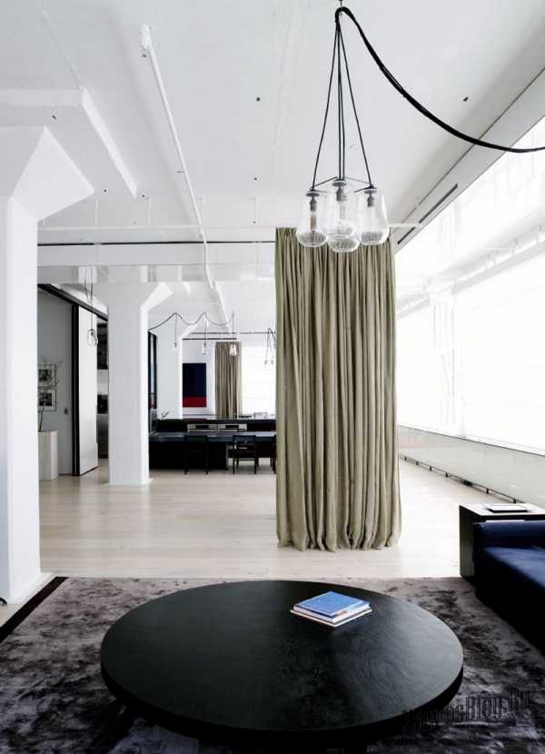 Чтобы сделать лофт более домашним и уютным можно отойти от строгих канонов. Например, повесить плотные шторы.