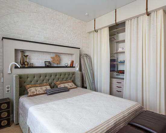 Часть спальни можно назвать гардеробной, в стиле лофт. Но и стена в комнате четко поддерживает интерьер
