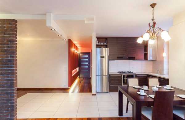 С нижней части помещения можно выделить разделение кухни и столовой, с помощью разного покрытия. Например: керамическая плитка может быть использована в кухне, а ламинат или паркетная доска в столовой.