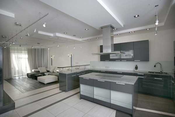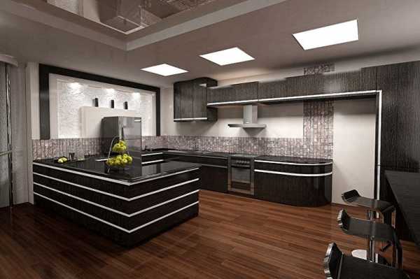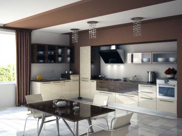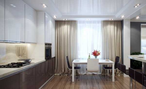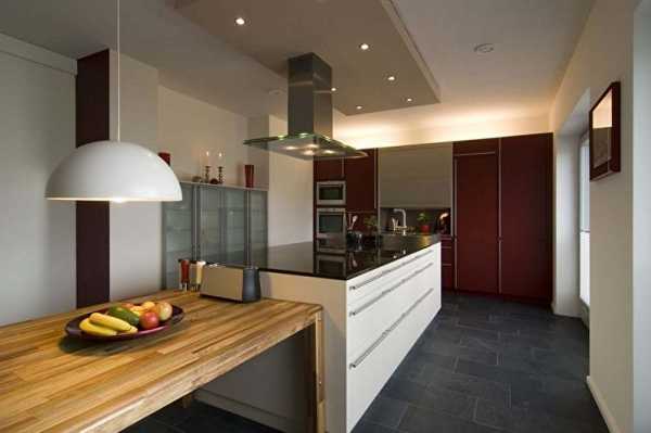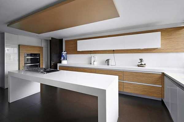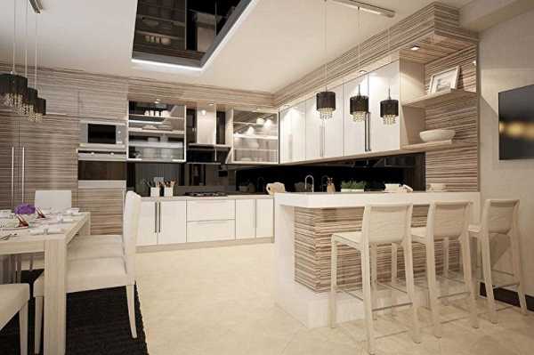Здесь потолок кухни оформляется исключительно в светлых тонах. Это может быть матовое или глянцевое натяжное полотно с системой точечного освещения. Более простой вариант – покраска или побелка. В современных интерьерах нередко используется гипсокартон, который позволяет не только создать идеально ровную потолочную поверхность, но и наделить ее фигурными элементами, в том числе, обозначающими ту или иную зону. Здесь совершенно недопустимо использование тканевых полотен, рисунков в виде фотопечати или росписи.