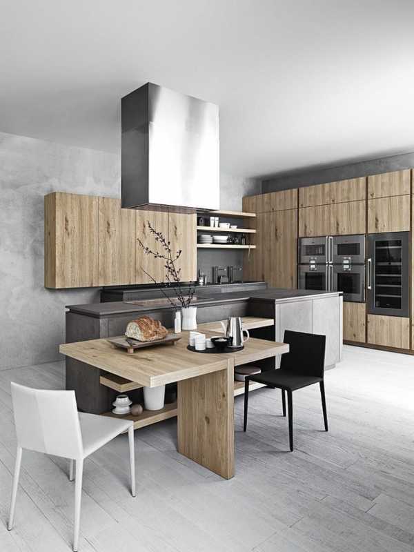 Что касается стола, подойдет любая простая модель без изысков, предпочтительно со столешницей из камня или натурального дерева. Очень удобно использовать стол-трансформер, особенно в небольшом помещении. В просторных кухнях часто организуется кухонный остров необычной формы, устанавливается большой стол.