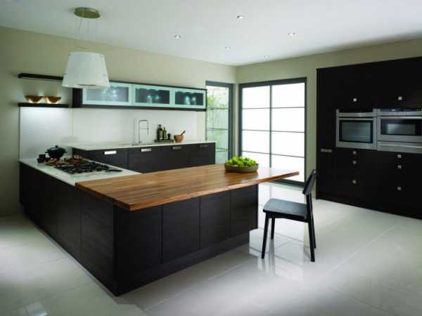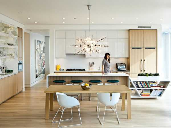 Если площадь кухни очень мала, и было решено совместить ее со столовой или гостиной, обеденный стол можно заменить удобной и современной барной стойкой. Такой «островок» будет хорошо разграничивать общее пространство. Если же пространства достаточно и есть возможность поставить обеденную группу мебели, то стол в таком случае может быть стеклянным, выполненным из шпонированого материала, натурального дерева, а ножки при этом могут быть деревянными или металлическими.