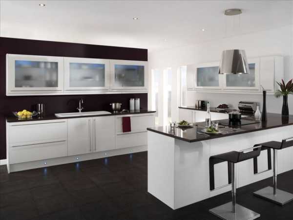 Над рабочей зоной и по периметру кухни следует продумать точечное освещение. В качестве эффектной подсветки гарнитура можно использовать неоновые светильники различных оттенков.