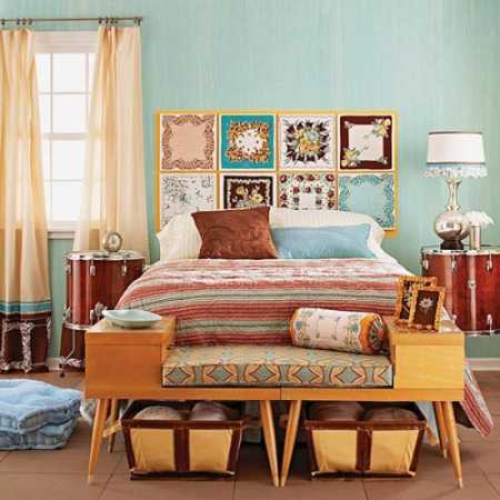 Если в гостиной на цвете стен стараются не акцентировать внимание, то в спальне их яркость значительно повышается. Кроме состаренной или старой мебели и других неотъемлемых атрибутов стиля используются фотообои, с размерами которых не стоит мелочиться — их делают во всю стену. Популярны картины с изображением знаменитых деятелей прошлого века. Яркие покрывала для кровати будут перекликаться со шторами, имеющими выразительный рисунок.