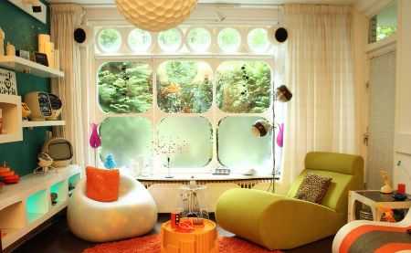 Как правило, комната декорированная под ретро, выглядит весьма ярко и привлекательно. Удивляет ее разнообразная цветовая гамма, эксцентричные узоры и причудливые формы фрагментов интерьера.