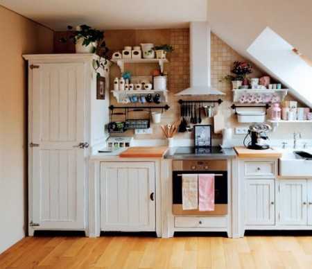 Для освещения кухни можно использовать небольшую люстру, на полках можно расставить коробочки из жести для специй и сыпучих продуктов, чашечки с блюдцами, разные безделушки, которые будут способствовать акцентированию внимания на стиле. Не следует слишком усердствовать — для создания гармоничной и комфортной атмосферы таких элементов старины потребуется немного.