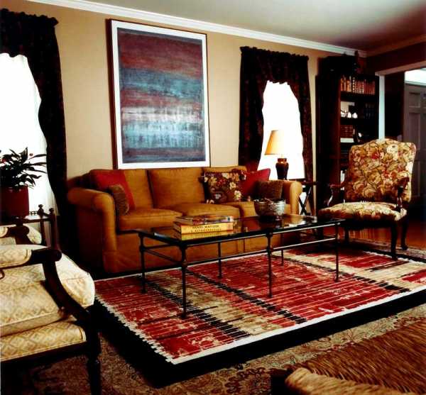 Ковер в интерьере гостиной- Существует дизайнерский принцип: чем больше площадь пола, незанятая ковром, тем контрастнее он должен быть.