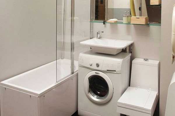 Если убрать ванну, то удастся даже в самом маленьком санузле установить машинку.