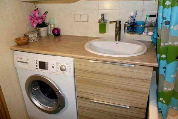 Ванные комнаты небольших размеров, особенно в квартирах домов советской постройки, таких как хрущёвки, не имеют специального места под установку стиральной машины. По этой причине, хозяевам таких квартир приходится искать выход из сложившейся ситуации. В таком случае хорошим вариантом является установка стиральной машины под умывальником, имеющим плоское днище.