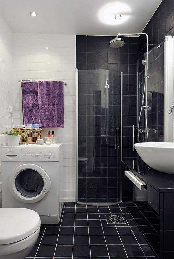 Стиральная машина в ванной комнате с небольшой площадью должна быть компактной – более узкой, с меньшей загрузкой. В узком помещении все-таки лучше, чтобы стиральная машина была загружена заранее, а процессу загрузки ничего не мешало.