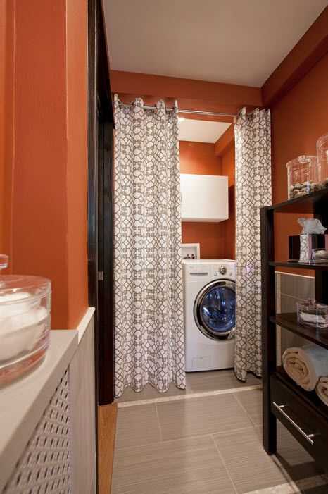 Шкафчики для стиральной машинки со шторами вместо двери.