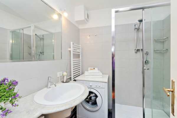 Используя душевую кабинку, можно поместить машинку в угол самой ванной комнаты.