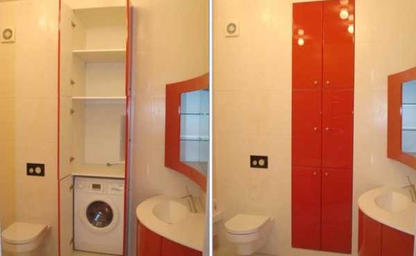 Если рассматривать более радикальные способы, позволяющие «вписать» машинку в условиях маленькой площади, то освободить пространство можно путем грамотной перепланировки. К примеру при совмещении санузла для размещения техники предусмотреть нишу под импровизированным сантехническим шкафом.