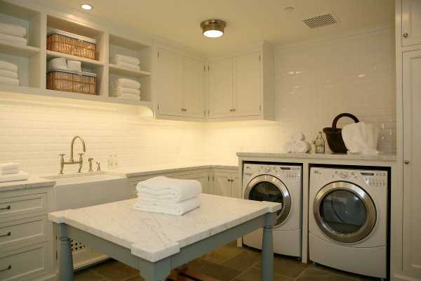 Стиральные машины с фронтальной загрузкой выгодны тем, что дают возможность рационально задействовать пространство непосредственно над техникой. Для этой цели над ними размещают столешницу или устанавливают раковину.