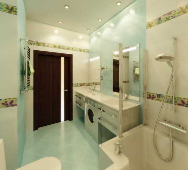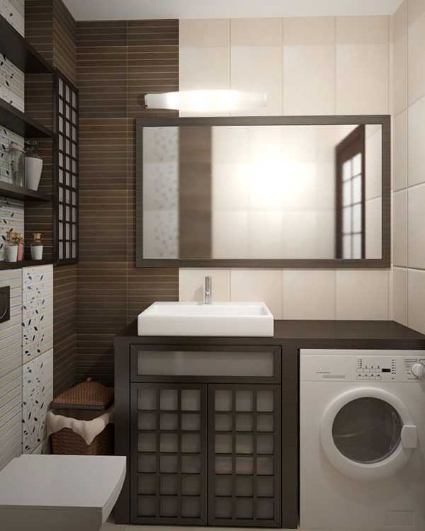 Может быть использован и вариант, когда размещение сантехники и мебели в ванной размещается по принципу зонирования. В результате стиральная машина и рукомойник будут отгорожены небольшими перегородками от остального пространства. Шкаф с зеркальными дверками расположенный рядом с ними позволит визуально увеличить пространство небольшой ванной. Эту задачу может выполнить и белая керамическая плитка, если будет сочетаться с цветом машины.