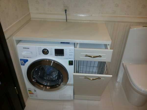 Рабочая поверхность столешницы идеально подходит для размещения банных принадлежностейЕсли стиральная машина не вписывается в интерьер санузла, ее можно «спрятать». Лучший способ это сделать – задекорировать за фасадом встроенной мебели, изготовленной на заказ. Мебель, выполненная по индивидуальным размерам, обойдется дороже, но она точно будет подогнана под параметры планировки и дизайн комнаты.