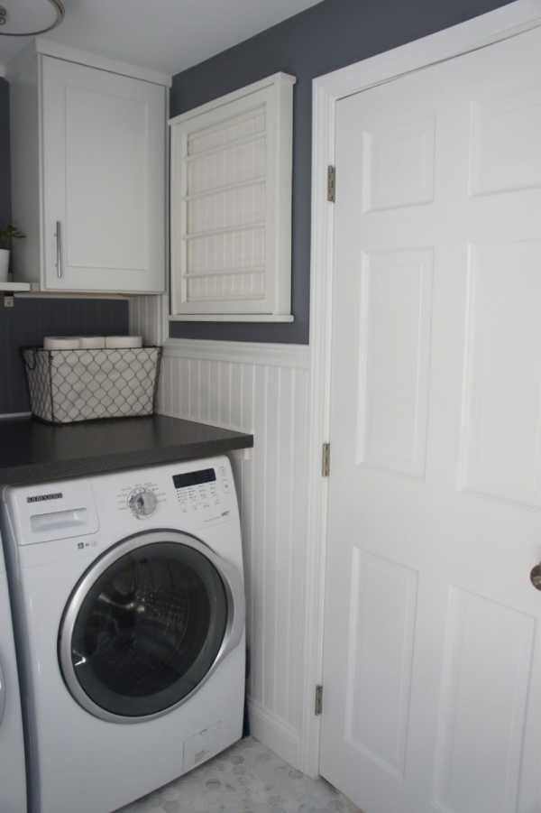 Если ванная комната граничит с миниатюрной кладовкой, то подумайте над объединением помещений. Получится как раз-таки ниша, в которой можно будет без проблем уместить машинку, место над ней использовать с гигантской пользой.