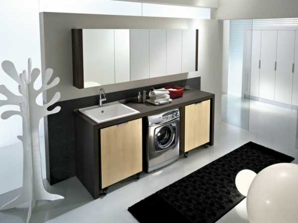 Если ваша ванная имеет скромные размеры, то вполне уместно расположить стиральную машинку под раковиной. Есть несколько преимуществ данного размещения: рациональное использование пространства непосредственно под раковиной и экономия места. Но при установке машины под раковиной следует позаботиться, чтобы она максимально закрывала ее поверхность, а также нельзя допускать попадания воды во время умывания.