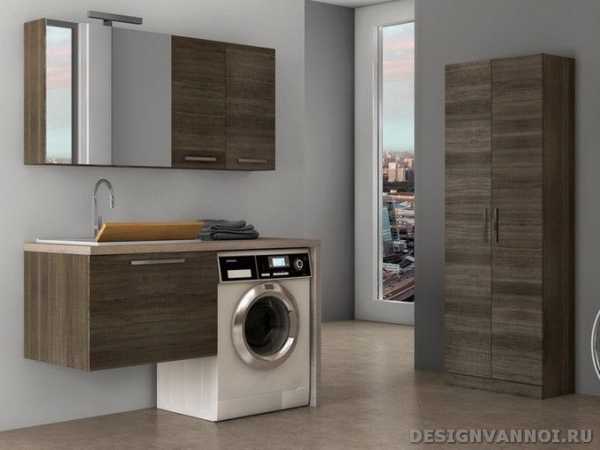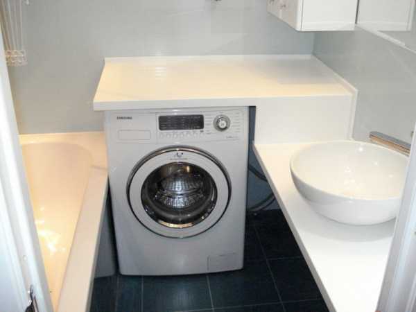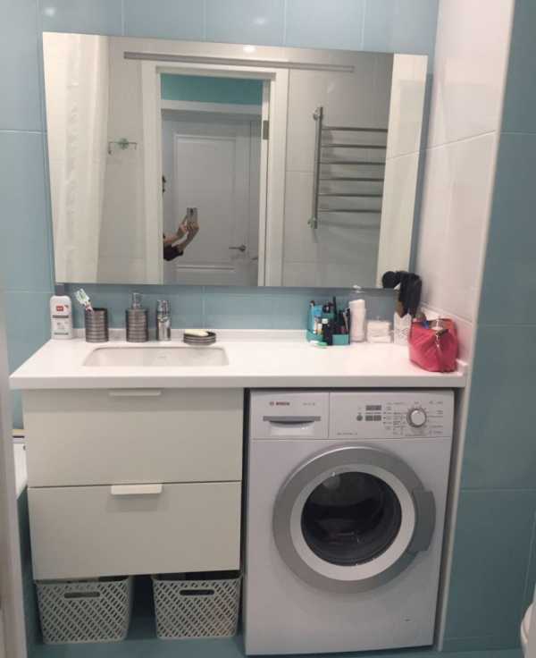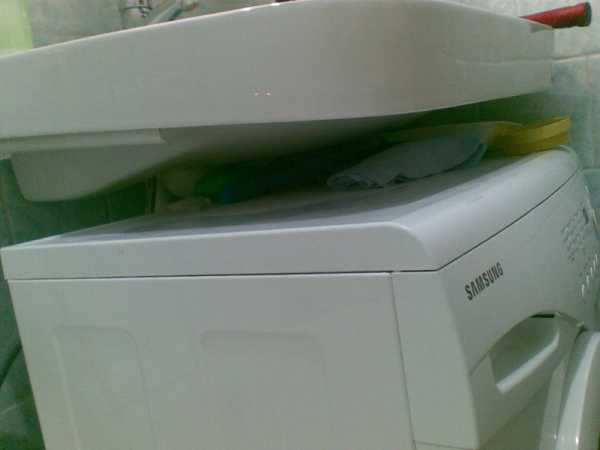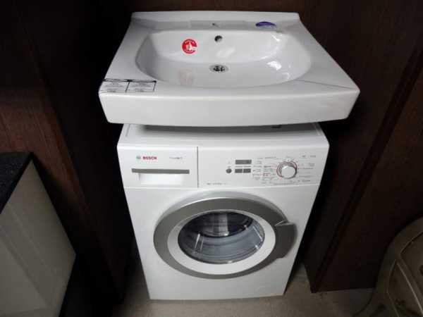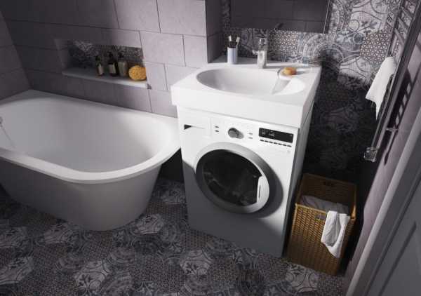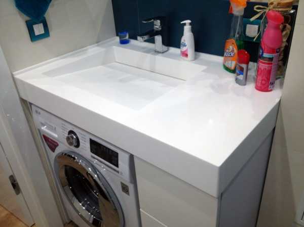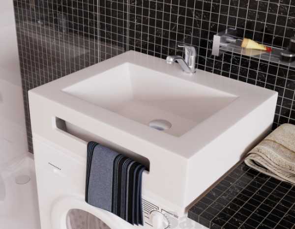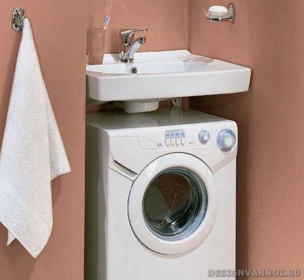 Умывальник обязательно должен немного выдаваться вперед над машинкой. Это уменьшает вероятность случайного попадания воды на поверхность последней.