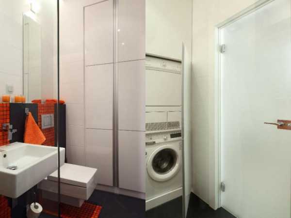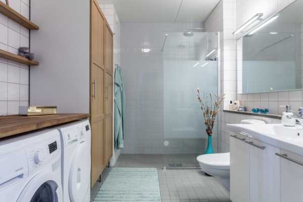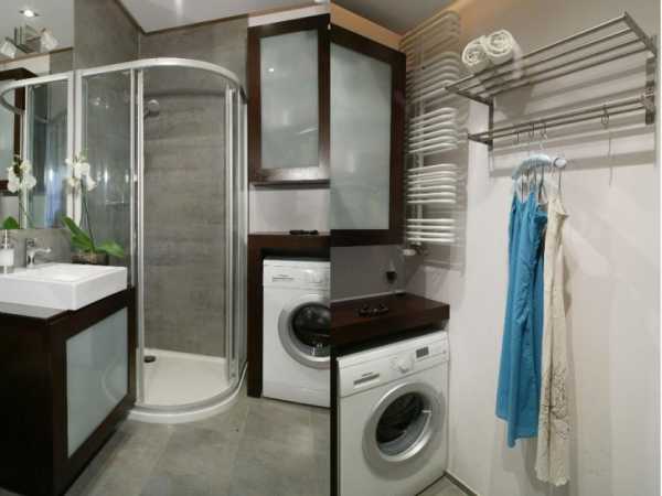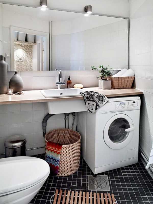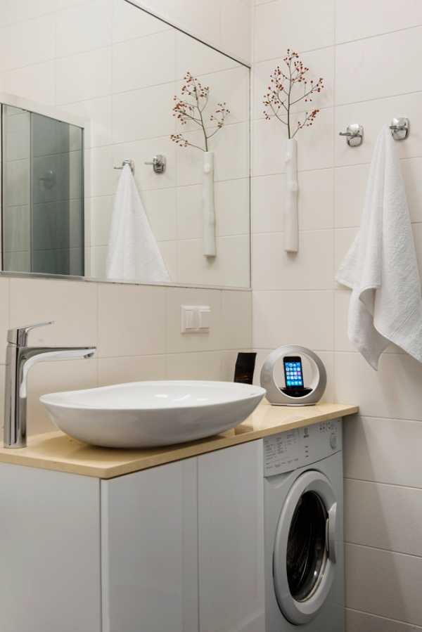 - Экономия пространства. Это касается не только ванной комнаты, но и всей квартиры: если ванная маленькая, стиральную машинку пришлось бы устанавливать в какой-либо комнате;