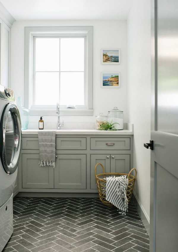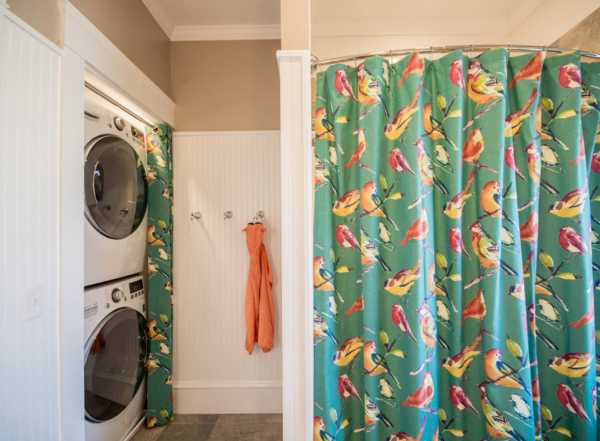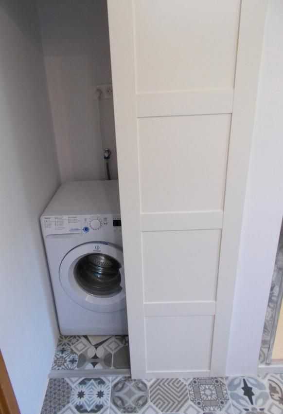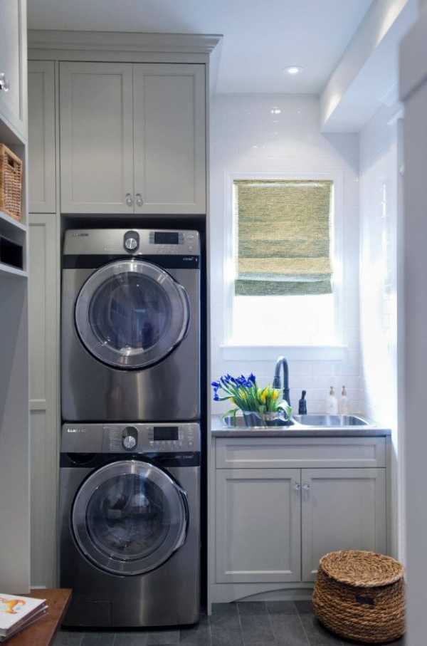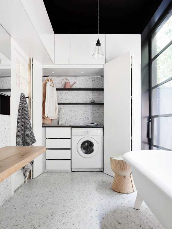 Если есть достаточно места в задней части комнаты, то можно даже сконструировать специальный шкафчик для прачечной, куда постаивть стиральную машину. Если техника не используется, то остается невидимой за закрытой дверью.