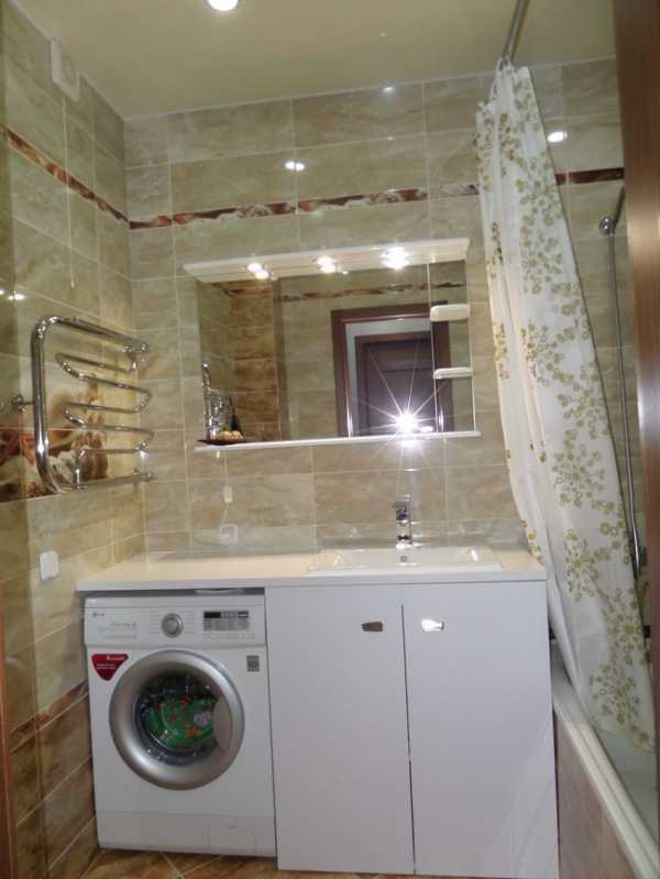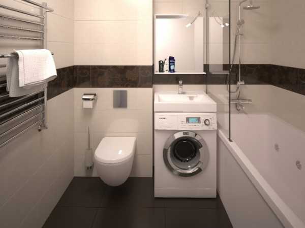 Удобное расположение умывальника над стиральной машиной в небольшой ванной комнате