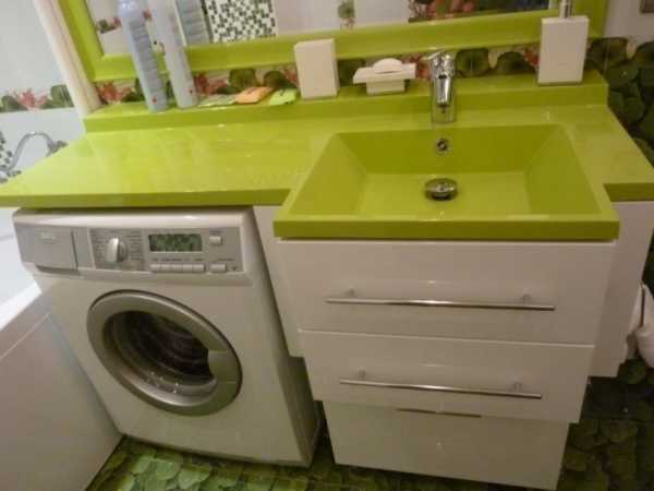 Сплошная столешница над тумбой и стиральной машиной, в которую установлена раковина