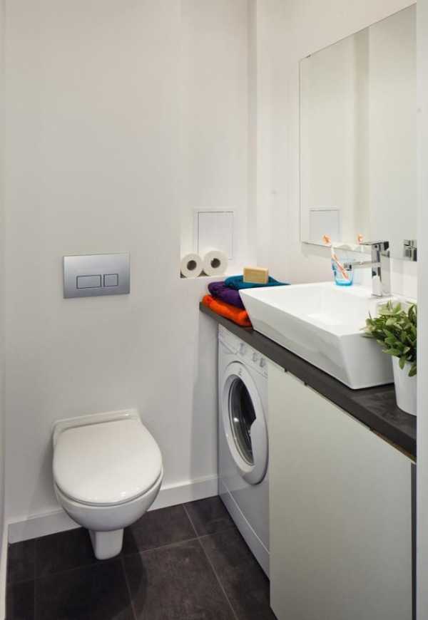 - И наконец, стиральная машина под раковиной займет место, которое большинство людей привыкли видеть свободным. Вполне вероятно, что в первое время она будет Вам немного мешать — да и чтобы открыть люк в маленькой уборной, тоже придется потесниться.