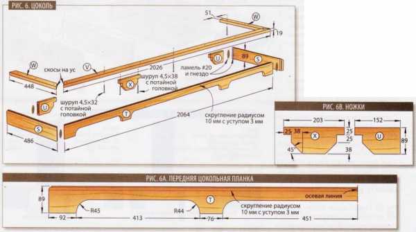 2. Выпилите боковые S и переднюю Т цокольные планки шириной, указанной в «Списке материалов», и длиной, превышающей указанную на 25 мм (рис. 6).