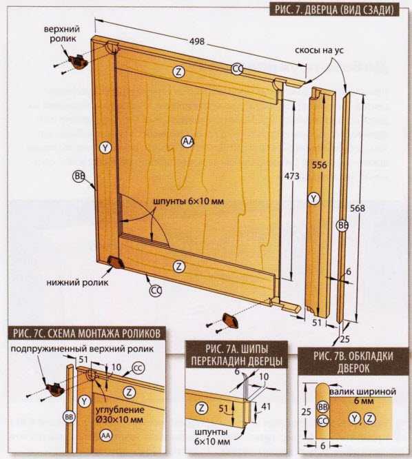 1. Выпилите стойки Y и перекладины Z дверок. Используя пильный станок с пазовым диском толщиной 6 мм, выпилите по центру внутренних кромок стоек и перекладин шпунты глубиной 10 мм. Затем установите пазовый диск толщиной 10 мм на высоте 6 мм над столом и, добавив накладку параллельного упора, сформируйте на концах перекладин шипы (рис. 7а). Выпилите филенки АА. Соберите дверцы без клея для проверки соединений, а затем разберите, склейте и зафиксируйте струбцинами, проверив на прямоугольность измерением диагоналей.