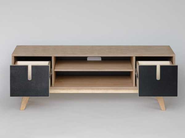 - Тумба под ТВ может быть сделана из фанеры. Фанеру для изготовления мебели начали использовать совсем недавно, имеется ввиду, что без применения красок, потому что на рынке теперь появились более качественные плиты, более высокого сорта. Они встречаются не во всех строительных магазинах, потому что она дороже, чем обычные, которые применяют для строительства.