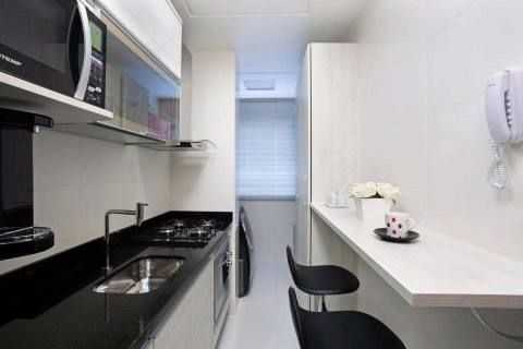 Похожее решение — использовать продолжение столешницы в качестве обеденного стола. Такой способ пригодится на кухне с двухрядной планировкой также в качестве дополнительной рабочей поверхности. К тому же он позволит сохранить место для хранения в верхних модулях.