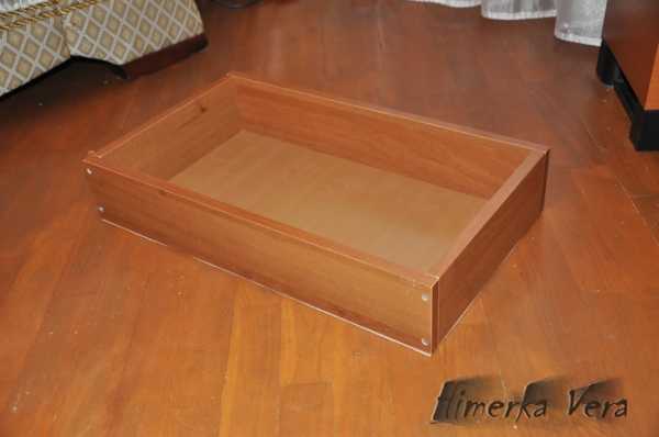 Столешница привинчена снизу. Ножки устанавливаются на место, когда стол перевернут, и выдвижные ящики уже установлены. Автор добавил маленькие прокладки из пенопласта на внутренней поверхности ящиков, дальше на фото показаны завершающие штрихи, как прикрыть машинку от пыли, но это на ваше усмотрение.
