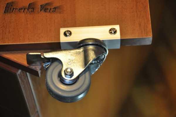 Колёсики были использованы не мебельные, а производственные для оборудования. Отличаются внешним видом и нагрузкой. Искала специально такие только потому что хотела что бы колёса были резиновые и два рахных крепления к столу. К основанию стола крепились колёсики с креплением «платформа», а к дверям и ножкам с креплением «под болт». К сожалению алюминивый п-образный профиль нам немного не подошёл, и в последствии был удалён, хотя мне нравилос больше с ним.