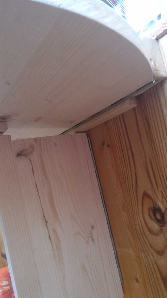 6. В виду слабого крепления снизу я в своем случае вынужден был усилить площадь опоры петли площадкой из фанеры.