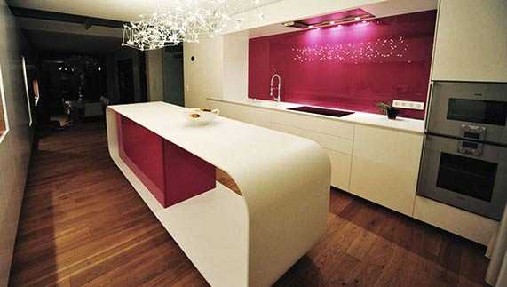 Кухни-столовые больших размеров, благодаря таким моделям, становятся эксклюзивными и сияющими блеском роскоши. Несмотря на бытующее мнение о том, что любое стекло хрупкое, эти столешницы достаточно прочны, так как изготавливаются из сталинита (каленого стекла). Они используются в оформлении стиля хай-тек и минималистического стиля.