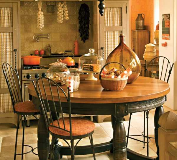 Мне нравятся овальные кухонные столы тем, что они вписываются в любую стилистику. Овальный стол хорош на кухне кантри.