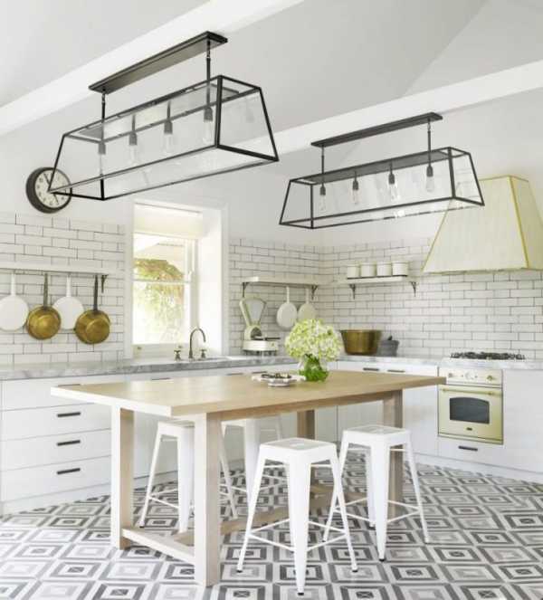 Вариант для кухонь от 12 кв.м. Над стоящим в центре столом хорошо повесить уютный абажур или сразу несколько светильников в ряд, чтобы получилась настоящая обеденная зона. Сам кухонный стол может быть любой формы, но особенно хороши круглые и овальные модели. Их можно обходить, не натыкаясь на углы, за такими столами помещается большее количество гостей, круглый стол сильнее объединяет сидящих за ним.