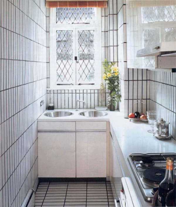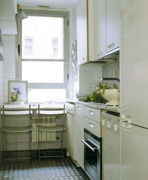 Маленькую кухню вдоль окна можно оформить разными способами.