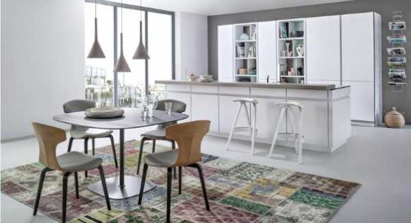 Поставив стол в центре, вы сразу получаете полноценную столовую зону в помещении. Вариант подходит только для просторных кухонь.