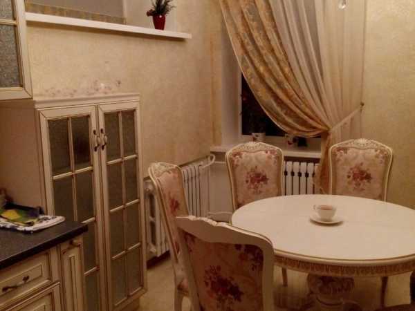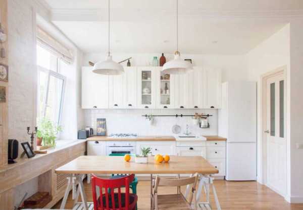 В маленьких кухнях есть только одна рабочая стена, в которую помещается мойка, плита и холодильник. То есть рабочего стола нет вообще, и готовят на кухонном, поэтому использование кухни вдоль окна — оправданный шаг. То есть кухня расположена углом, с края угла вы можете поставить такой громоздкий предмет как холодильник. Обеденный стол в таком помещении и так маленький, поэтому он практически не пострадает.