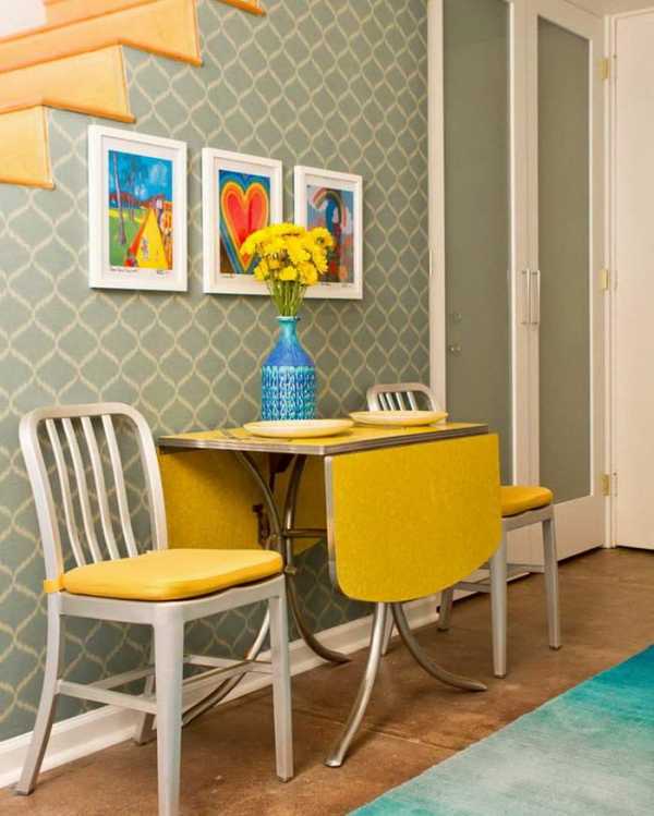 Ретроинтерьер с эргономичным раскладным столом-книжкой яркого желтого цвета