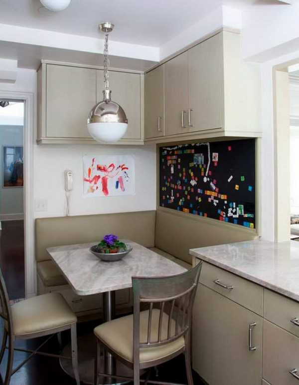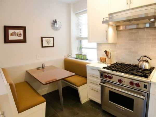 Современная малогабаритная кухня с компактным раскладным столом и удобными вместительными диванчиками