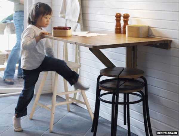 Откидной компактный столик – вариант, как в купе, на одного/двоих. Табуреты в этой кухне не раскладные, но при этом занимают очень мало места – их можно сложить друг на друга.