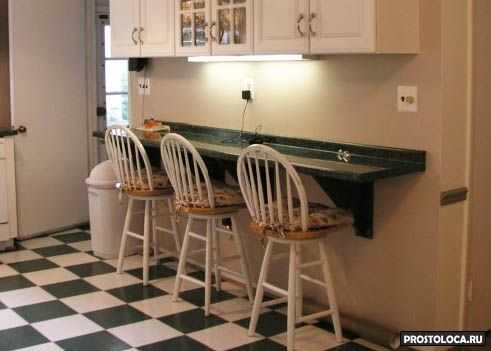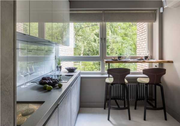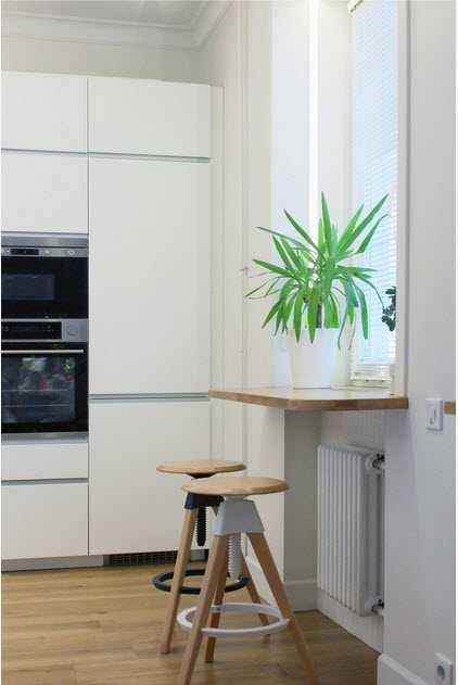 В этом проекте кухни небольшая стойка является продолжением подоконника. Главная здесь задача – найти стульчики правильной высоты. Единственный вариант – модели на винтах или с плавной регулировкой. Стандартные или традиционные барные не подойдут: первые – слишком низкие, вторые – чрезмерно высокие.