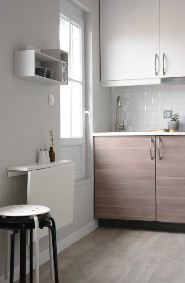 Раскладывающийся обеденный стол, закрепленный на стене, имеет нишу в стене, куда прячется за ненадобностью. Компактное размещение кухонной мебели выполняет сразу несколько функций, что ценно для малогабаритной кухни
