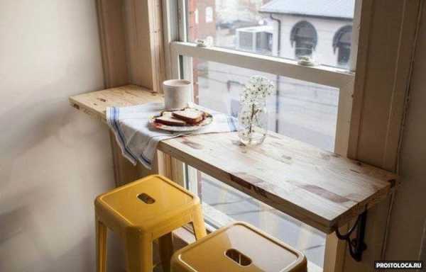 Снимите стандартный подоконник и замените его столешницей из панелей (древесных, МДФ, пластиковых и др.). В результате вы существенно сэкономите пространство помещения и получите оригинальное место для трапезы.